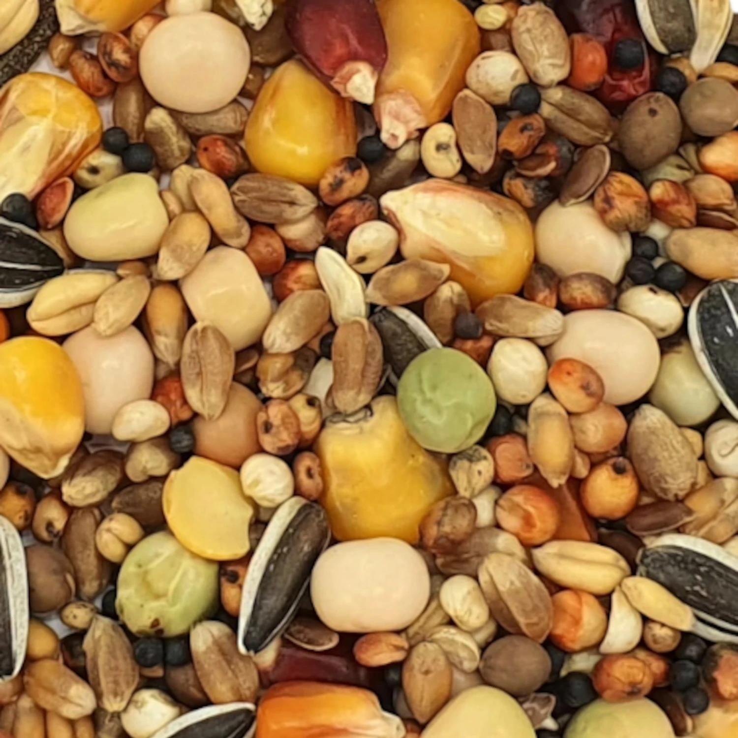 Weizen hell, Cribbsmais gelb, Milokorn rot, Erbsen gelb, Dari weiß, Wicken, Dunpeas Erbsen, Kardysaat, Sonnenblumenkerne gestreift, Rubsen, Leinsaat, Cribbsmais Bordeaux, Hirse weiß